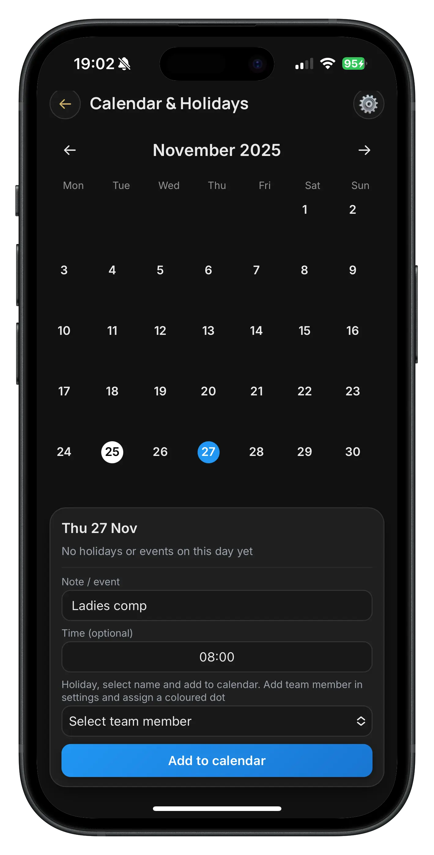 Select a date, choose a team member from the dropdown, and tap Add to Calendar.
