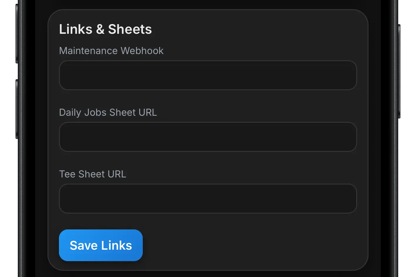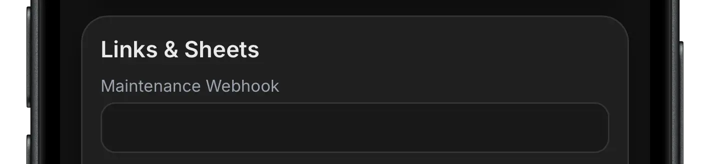 In Settings → Links & Sheets, paste your Maintenance Webhook URL from Google Sheets.